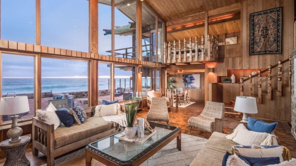 True to form, the Camino Del Mar residence is almost all exposed cedar and arbor and has massive windows to maximize the ocean view. The property sits on the beach and has a 60-foot oceanfront deck. Other features of the property include stained glass, stone masonry, a large courtyard and a pool and spa.
