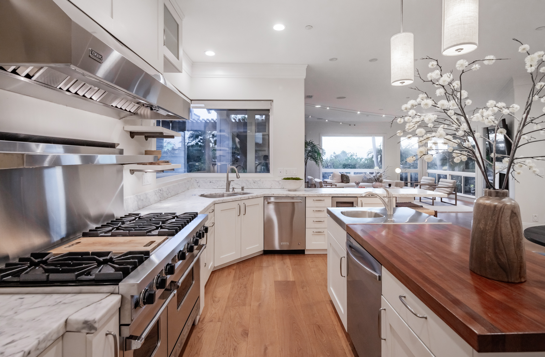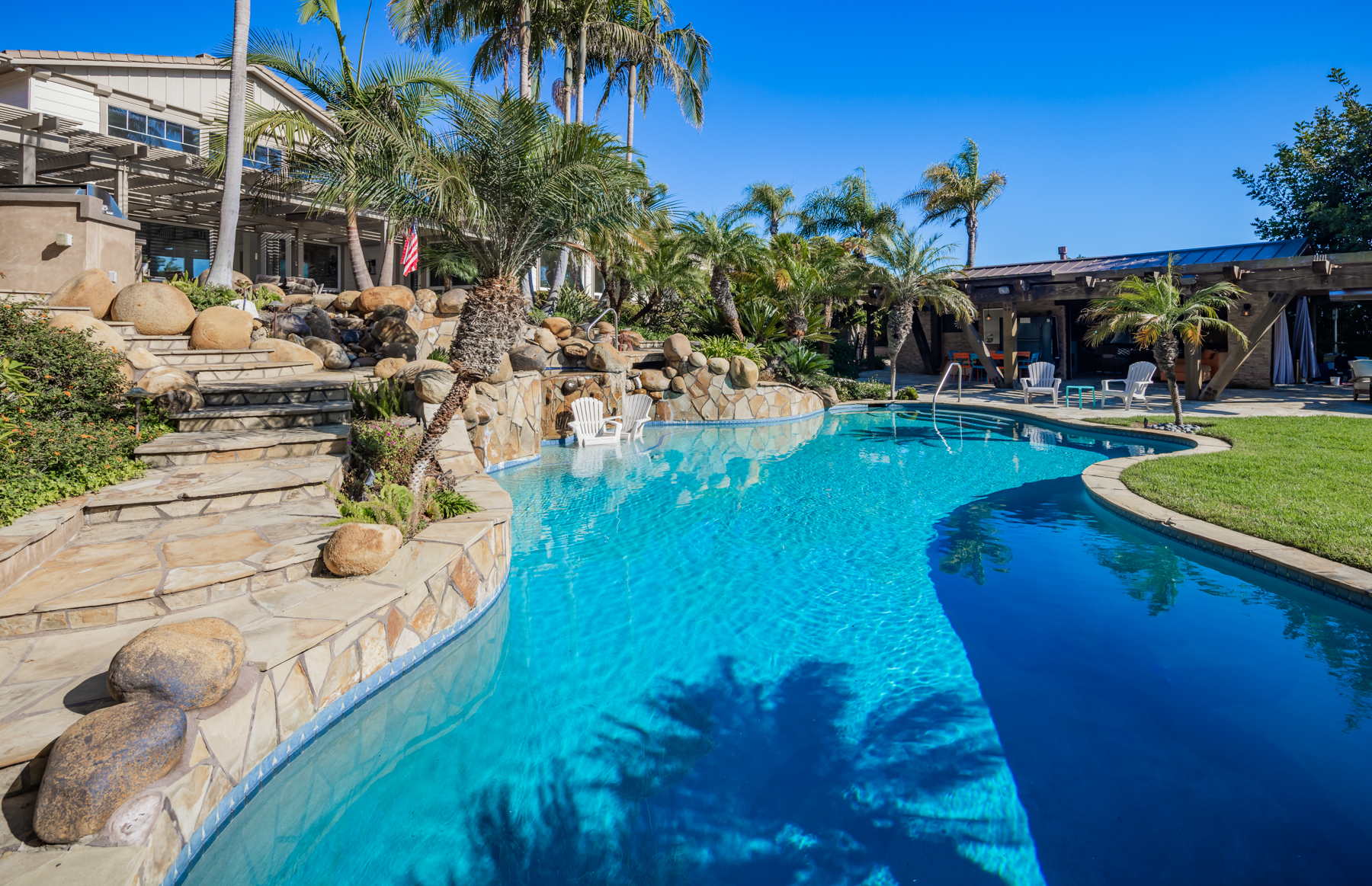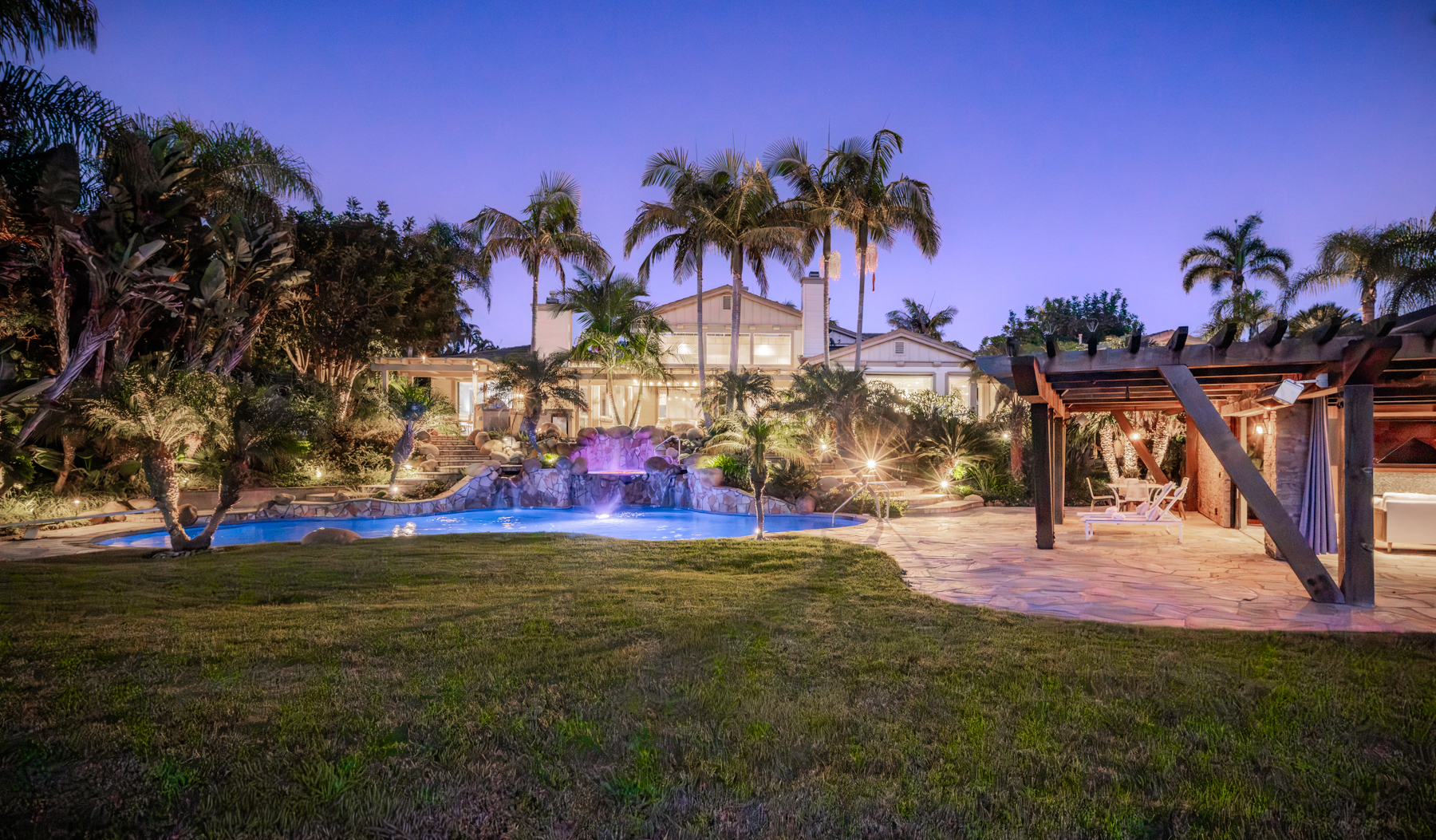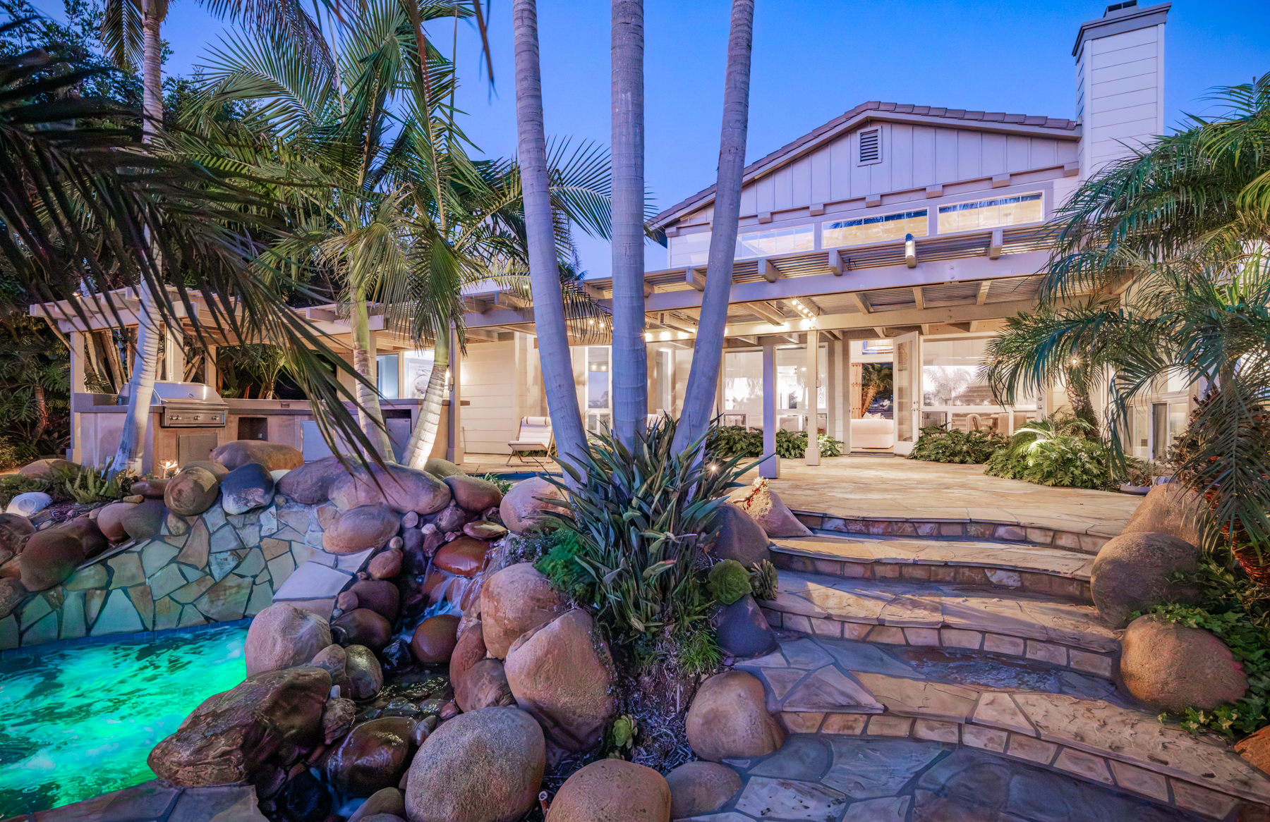 The detached guest house features a full kitchen and bath, perfect for extended stays. Outside, enjoy the ultimate backyard retreat with a heated pergola, built-in BBQ, bar, and ocean-view seating. The pool house opens to a resort-style pool with waterfalls, a spa, and baby plunge pool; ideal for entertaining.