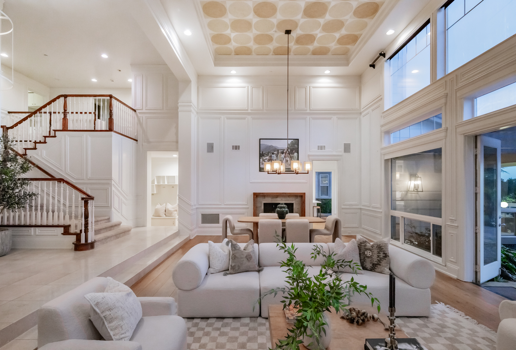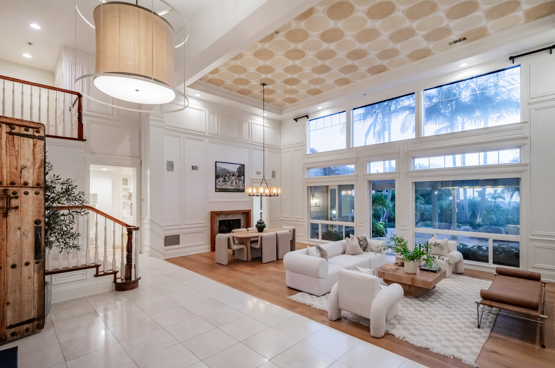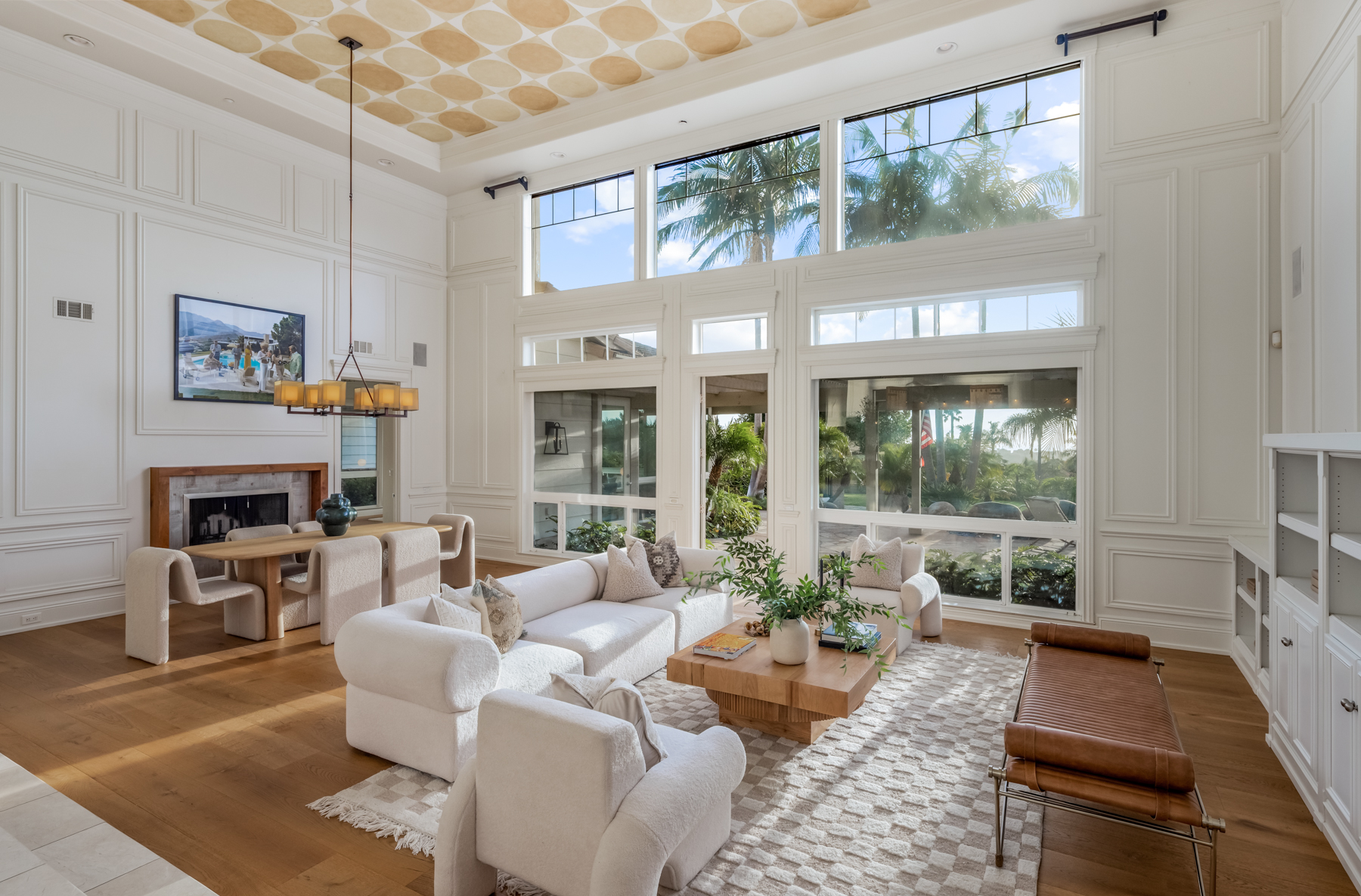 Impeccably landscaped with exotic foliage and vibrant blooms, the property welcomes you through grand Spanish-style double doors into a light-filled interior featuring wide-plank oak flooring, crown molding, and elegant tray ceilings. A wall of picture windows in the formal living and dining areas captures the stunning coastal views, while the family room offers a cozy space to unwind by the fire.